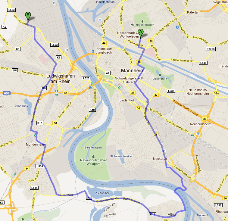 23,8 km für den Fußweg. Google erkennt, dass ich gerne mit dem Schiff fahre. Zur Vermeidung von Brücken wird die romantische Fährüberfahrt vom Neckarauer Großkraftwerk nach Altrip vorgeschlagen. Ich entscheide mich dennoch für die 6,1km lange Autostrecke, mit den nebenanliegenden Fahrrad- und Fußwegen, in welchem Zustand auch immer.
