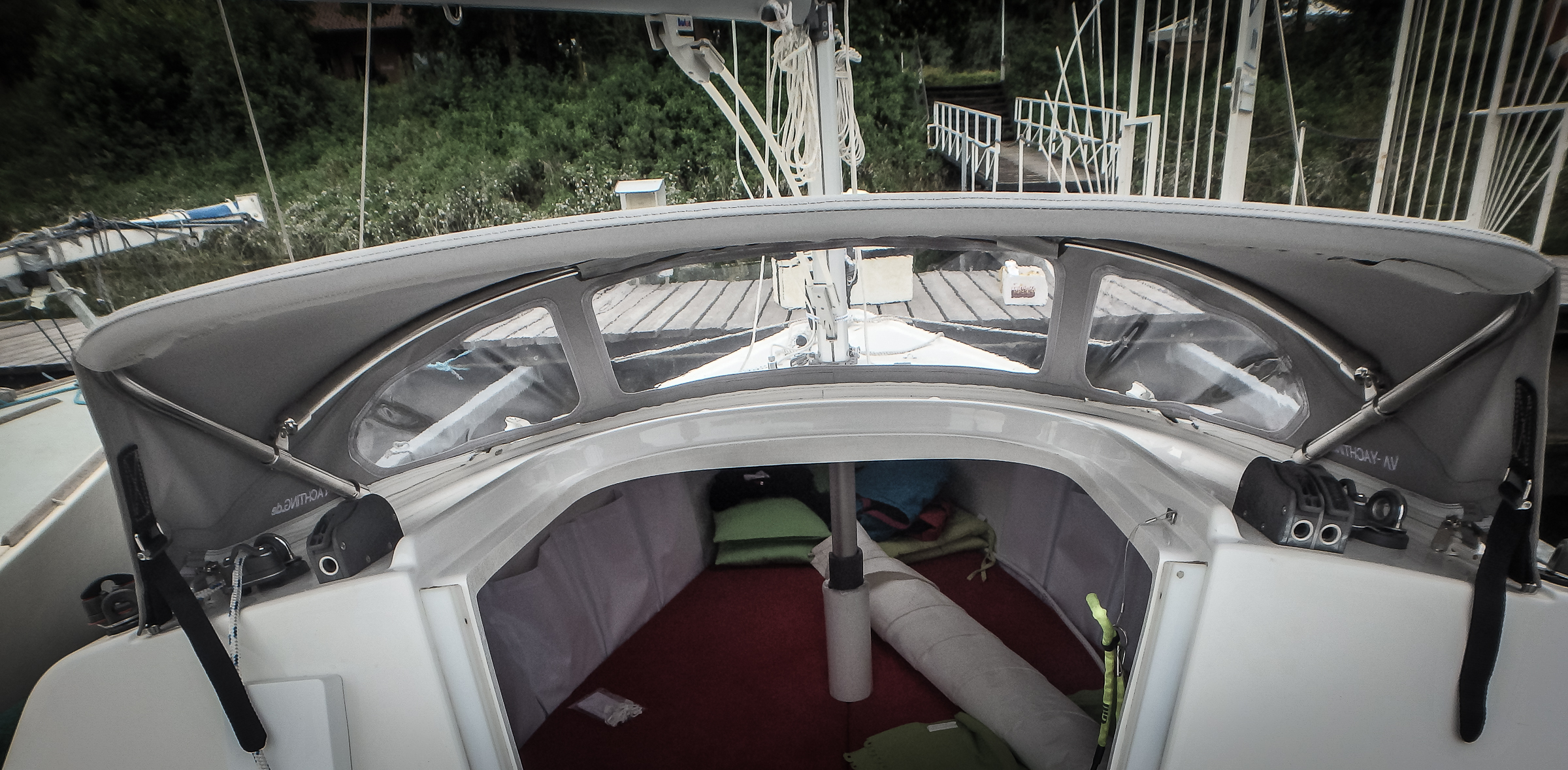– Sprayhood mit fenstern oben, Knicke vermeiden, sicher ablegen und vorsichtig in die schiene an deck schieben