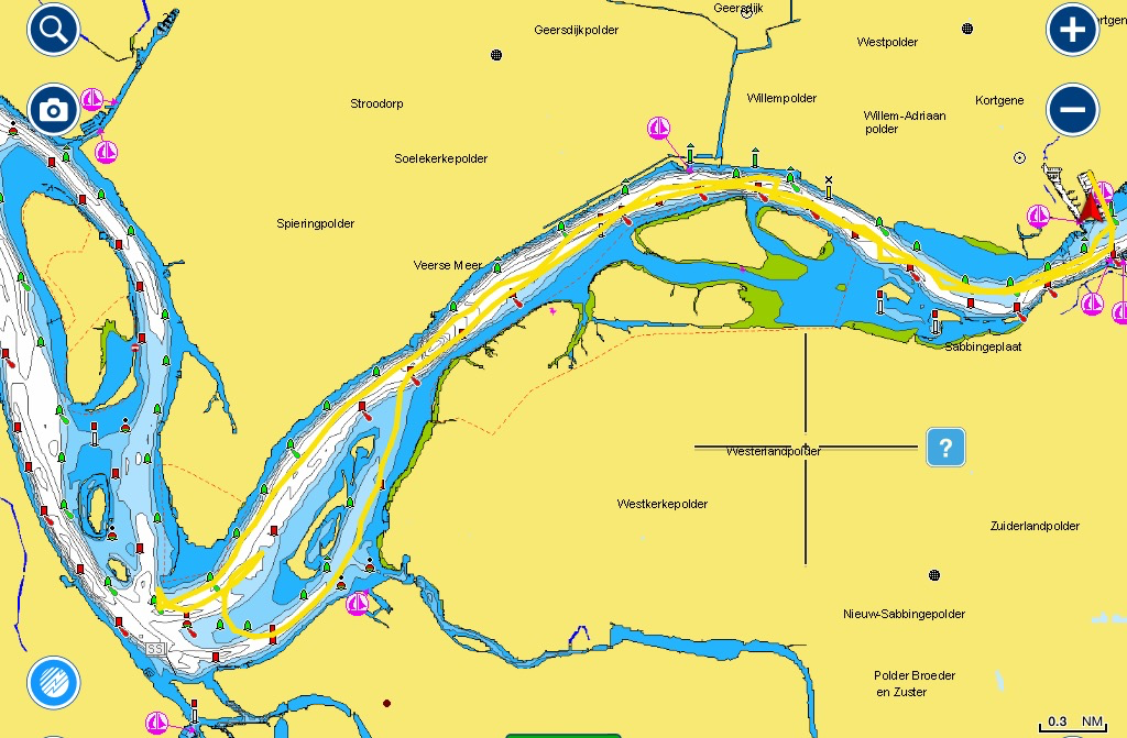 And just recently saw a far to big yacht for this area getting stuck in the middle of the fairway. Which brings me to my other observation sailing in Zeeland: never ever navigate and trust fancy navigation apps! Use a recently updated paper nautical chart. Following screenshot of Navionics app shows my track doing the two times kissing & riding by drifting too far starbards of the imaginary line marked by the red buoys. Considering the paper chart during sailing (as on the IPad with daylight beaming on its surface you cannot see any dot on the digital chart) I knew that the depth was around 1.3m – 1.1m. The echolot showed 0.8-0.9 when the boat got stuck on ground. There is almost no tidal range in Veerse Meer. But Navionics showing 2.4m depth is just wrong and proofs that it should only be used for planning, tracking and checking the current position with where you think you are pointing on the paper chart.