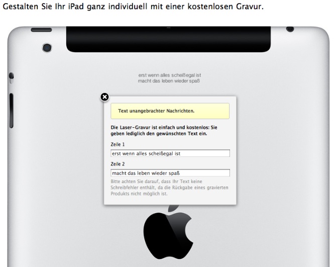 Der Apple Store Deutschland verhindert mir das Hinzufügen meines Lebensmottos – Erst wenn alles scheißegal ist macht das Leben wieder Spaß – als Gravur. Beim versuchten Fortsetzen meines Online-Einkaufs erscheint die Warnung in gelb: Text unangebrachter Nachrichten. Würde diese Meldung in den Programmen erscheinen, die ich zur Finanzierung meines Lebensunterhalts und teurer Hobbies (z.B. Produkte von Apple erwerben) programmiere und teste, würde ich ermöglichen, die Meldung einfach wegklicken zu können, um den Einkauf fortzusetzen. Ich suche einen Ausweg – und probiere das irische Einkaufsportal – es akzeptiert meine deutsche Gravur. Dennoch neugierig geworden teste ich nun englische ‘unangebrachte’ Gravuren im deutschen Apfeleinkaufsportal. M**F**er geht schon mal nicht. Ich probiere ein deutsches Wort aus, das ich nie in den Mund nehme und jemanden, der mich derartig beschimpft, sofort anzeigen würde. Dieses Wort kann ich als Gravur für ein IPad bei store.apple.com/de verwenden. Zumindest falschgeschrieben. Dahingegen funktioniert die Gravur: Miststück.