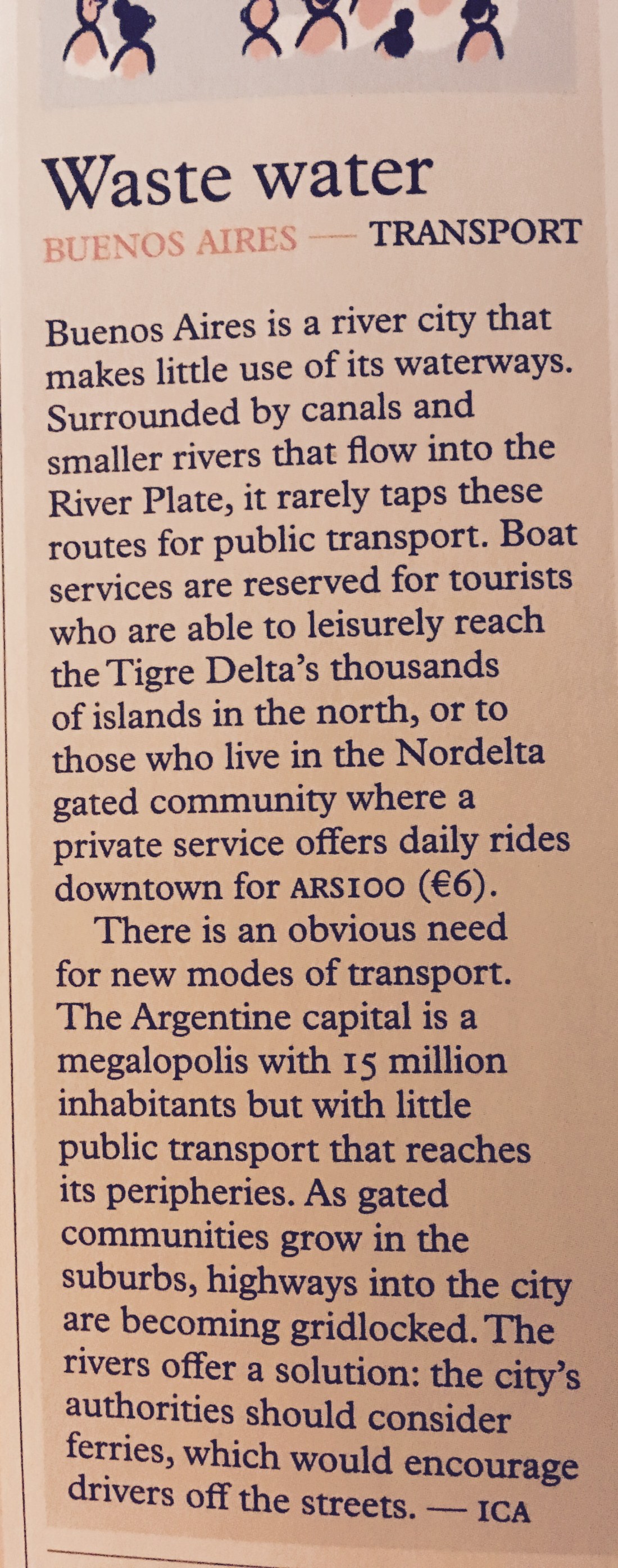 - Eine U-Bahn oder Zugfahrt zwischen 4 und 5 Pesos, die von der SUBTE Karte, mit der man sich in ganz Buenos Aires mit Bus und Bahn befördern lassen kann, abgezogen werden. Bei Zugfahrten ist darauf zu achten, dass man beim Verlassen des Bahnsteigs, z.B. Retiro nicht zweimal entwertet, sofern man am Ausgangsbahnhof eine Quittung für den Abzug der Fahrkosten von der blauen Subte Karte bekommen hat. Stattdessen händigt man die Quittung an das Bahnhofspersonal aus, die einem den Durchgang durch das Tor ermöglichen.