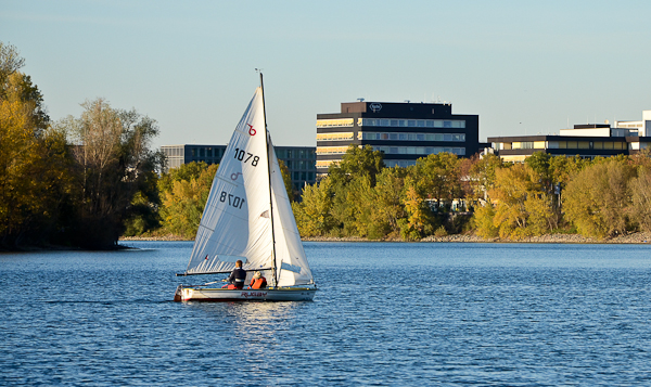 Nach schraubenbedingter Beendigung des Vorankommens unter Motor musste das Binnenschiffahrtsstraßensegelabenteuer nach Überprüfung des Allgemeinzustands des Segelbootes und des Vorhandenseins von Paddeln also unter Segel fortgesetzt werden. Dabei ist besonders dem Sog und Wellenschlag der begegnenden Berufsschiffahrt fernzubleiben. Bugwellen der Berufsschiffahrt sind im rechten Winkel zu befahren, da sonst ein Kentern der kielfreien Segeljolle möglich ist. Für alle Fälle ist der Hafenfunk auf Kanal 11 erreichbar. Wir hatten kein Funkgerät an Bord, dafür aber Proviant, GPS-Gerät und eine Spiegelreflexkamera.
