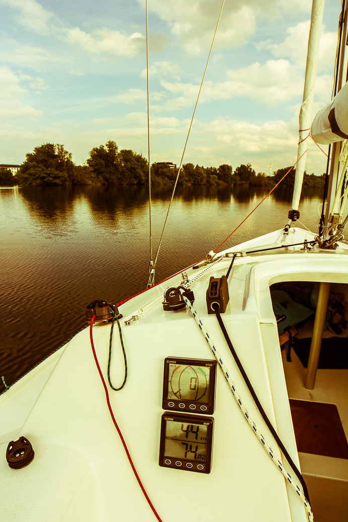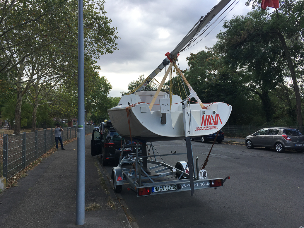 Un demi cours francais au bateau. Die eigentliche Idee war, wer deutsch spricht geht über Bord. Das haben wir dann aber doch nicht so durchgeführt. Erstens war das zulässige Gesamtgewicht von 450 kg vermutlich bereits mit 5 Personen und drei gefüllten Kühlboxen überschritten, dass sich das Überbordgehen erübrigen würde und wir selbst französischsprechend sinken, zweitens hatte La Navigatrice das französische Segelvokabular nicht gelernt und keine langage de commande, stattdessen eine angeblich verführerische englische Voicemailansage auf dem Diensthändi, was unserer Sizilianisch-Wallonischen Professeur auf der Suche nach dem Otterstädter Stützpunkt der Seglervereinigung Mannheim aber auch nicht weiterhalf und sie nach 45 minütigem Kreisen durch die Straßen von Otterstadt auf dem Netto Parkplatz verzweifeln ließ. Irgendwann haben wir uns dann aber doch alle auf der MILVA eingefunden, mit grünen Smoothies, Vin Rouge, Saucissons, Baguette, Jeanette Claudette und wie sie alle heißen und segelten unter Genuasegel bei kleiner Windstärke in der Abendsonne im Otterstädter Altrhein.