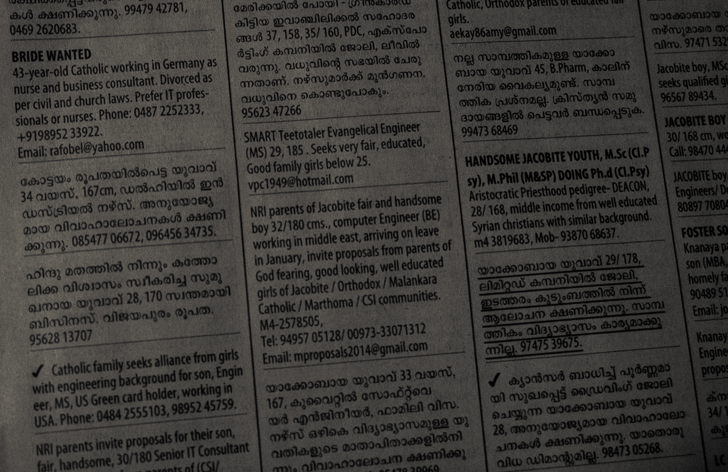 Als mich der gnädige Tuktukfahrer nach halbstündiger Holpertour in meiner ersten, luxuriöser anmutenden Unterkunft absetzt, liegen Kopfkissen zum Auslüften in der Hofeinfahrt des paradiesischen Pflanzenzuchtbetriebs, und Tomy, der Besitzer, ist gerade noch dabei, mit seiner Frau Raji mein Bett zu machen. Das Zimmer hat ein Bad mit richtiger Duschwand, Wasserkocher, ein paar Teebeutel eher geschmacklosen indischen Schwarztees, Instantkaffee und Milchpulvertütchen. Raji bringt mir Bananen aus dem Garten und etwas Gebäck. heiratsanzeigen-1Mehr braucht es auch nicht für einen  erholsamen Nachmittag im Korbsessel vor dem Haus und eines Spaziergangs durch den Garten der 500 Pflanzen. Als Lektüre bieten sich mir Heiratsanzeigen – Matrimonial Classifieds – nach Religion sortiert (Christian Wanted Bride, Hindu Wanted Groom, Muslim Wanted Bride) und ein schwedisches Frauenmagazin an, das mit aktuellen Weihnachtsdekotipps, Krampfadertherapien, Königin Sylvias 70.Geburtstag und einem Interview mit Marie Fredriksson tituliert, zu ihrem neuen Album ‘Nu’ (Jetzt) und ihrer Lebenseinstellung nach der Gehirntumorerkrankung: